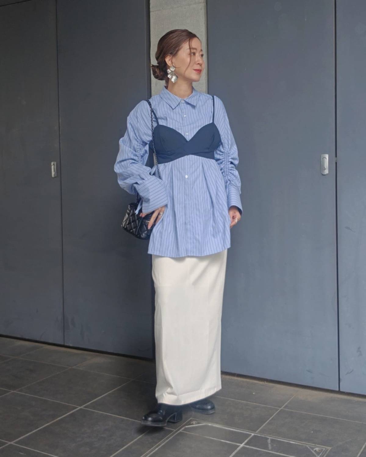 【10月編】センスいいスカートコーデ③シャツ×ビスチェの重ね着が◎