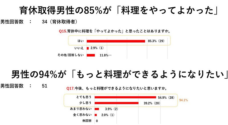 さらに、女性の72%が「パートナーが料理をしてくれてうれしかった」と答え、育休中に料理を経験した男性の85%が「やってよかった」、94%が「もっとできるようになりたい」と回答している。
