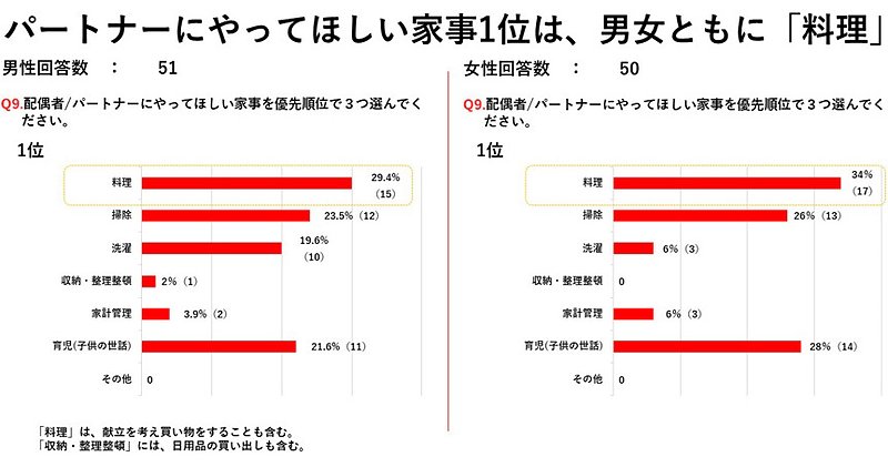 「最も苦手な家事」では男女ともに料理が上位に挙がり、さらに「パートナーにやってほしい家事」でも1位は料理だった。