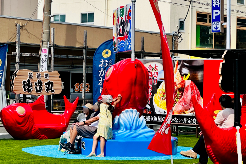 「金目鯛広場」には巨大な金目鯛オブジェやベンチを設置。写真撮影や休憩に最適な憩いのスペースとして利用できます。