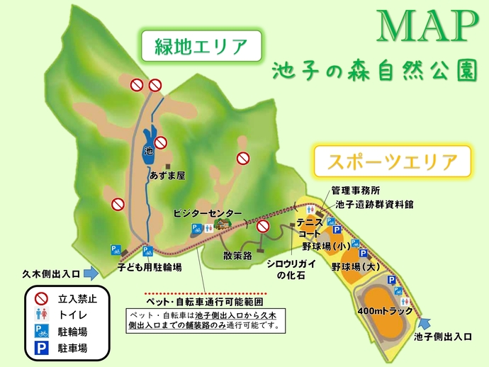 途中にあるビジターセンターにはお手洗いが付いており、その隣の一室で以前この地にあった柏原村の歴史や緑地エリア内の動植物一覧を見ることができます。コウモリやホタル、またオオルリやホトトギスいった野鳥など普段お目にかからないような珍しい生き物も生息しています。