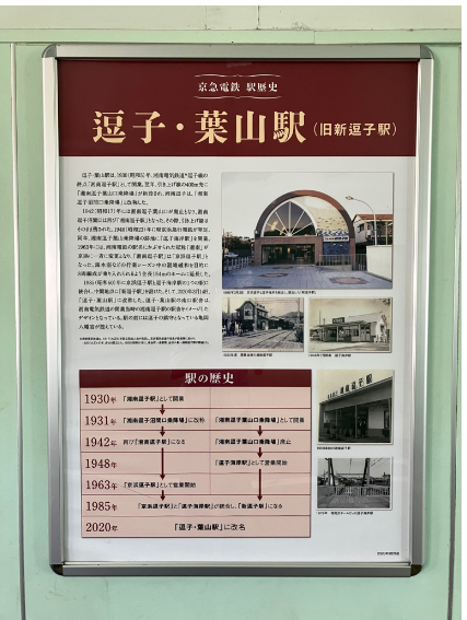 一昔前までは少し先のバス車庫あたりに「逗子海岸駅」が存在していました。当時は複線でしたが、8両編成用ホーム新設のため、一駅手前の京浜逗子駅と合併して廃止。そんな駅の変遷の案内板が南口改札前にあります。懐かしい方々も多いのではないでしょうか。