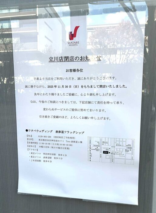 《閉店》グリーンスプリングス1階の『ワタベウェディング 立川店』が11月末で閉店してる