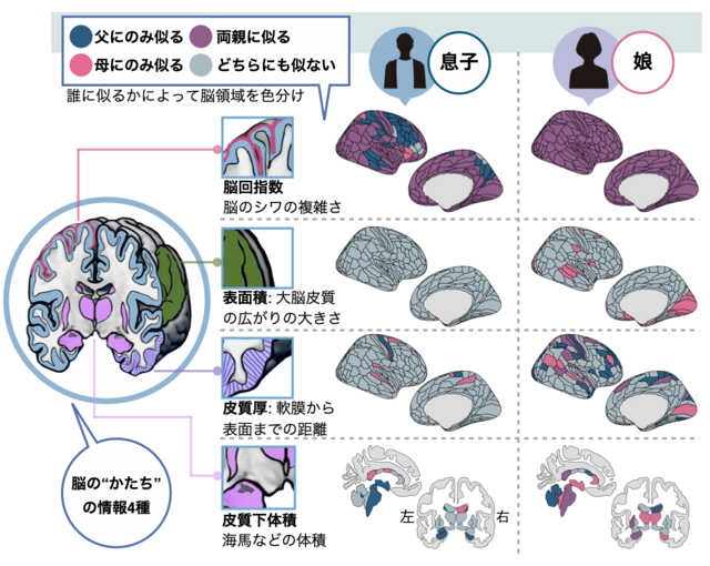 たとえば、図を見ていただくと、息子の脳における「父親にのみ似る領域(青地)」は、①脳回指数と③皮質厚(大脳皮質の厚み)、④皮質下構造の体積に青地になっている部分があり、かつ息子の青地は娘よりもやや多いことが読み取れます。