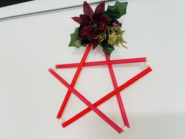 5本のストローをつなげて折るだけで、あっという間に立体的な星形オーナメントができあがりました。