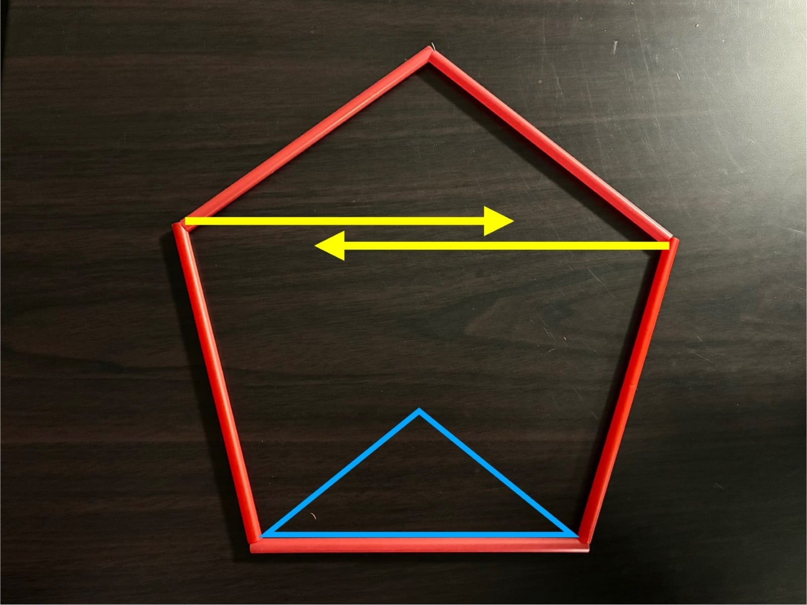 4.五角形の上部の2つの角を内側へ折り込むようにして交差させ、(写真の黄色い矢印)、下に三角形をつくります(写真の青い三角)。