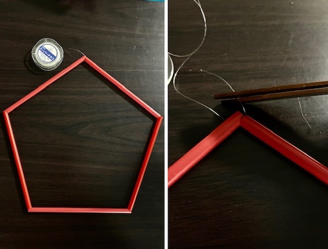 3.五角形になったらヒモを結び、余った部分はカットします。