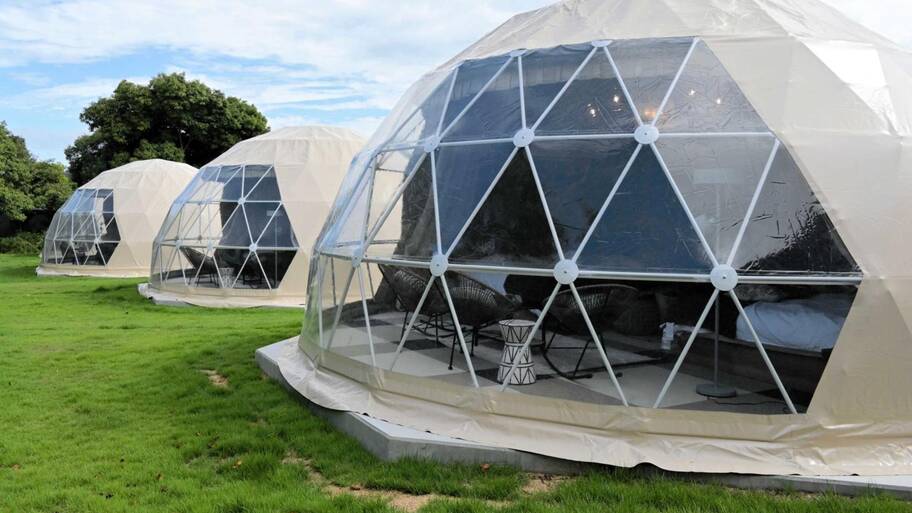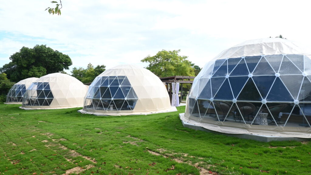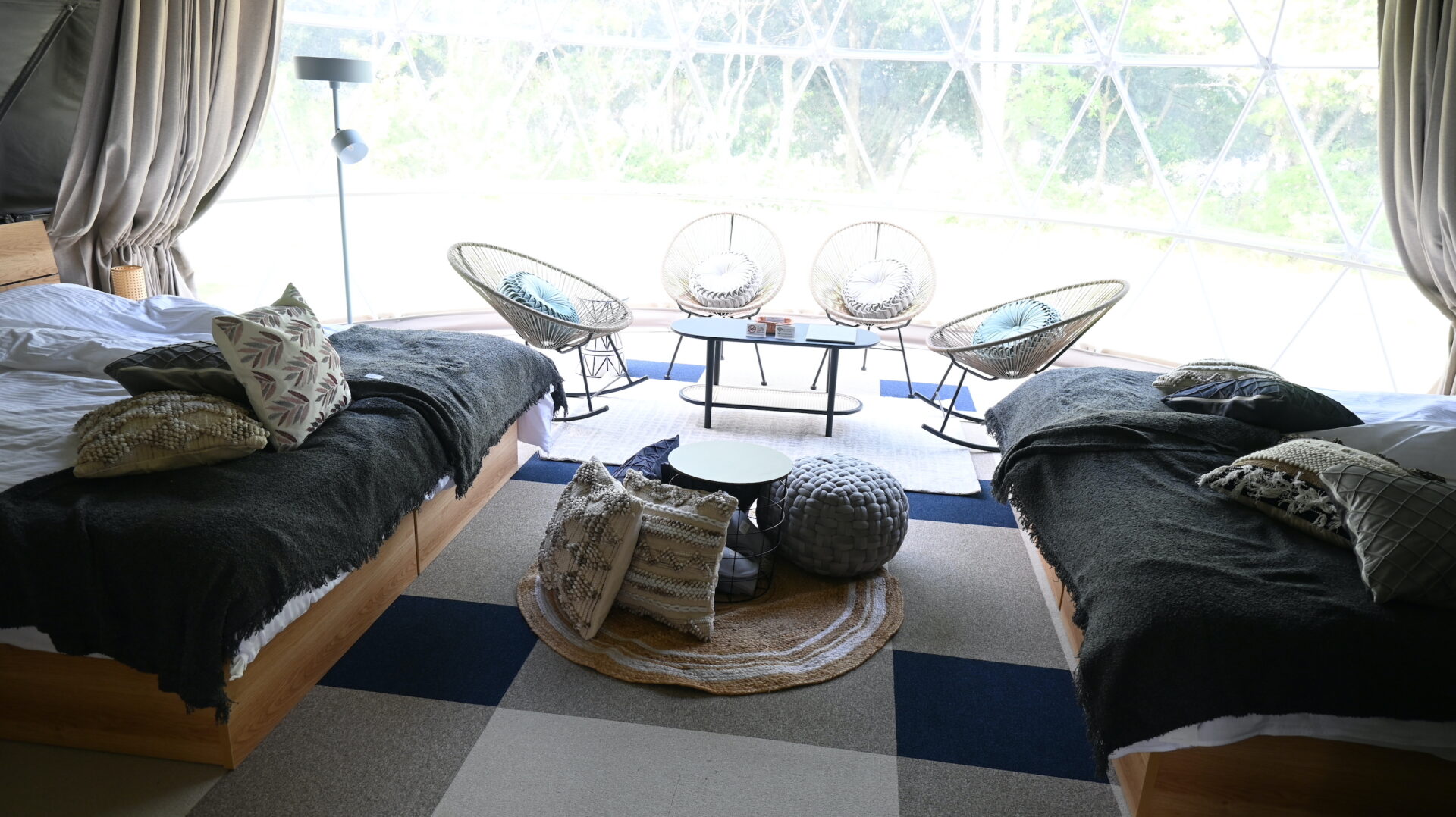 場所は、公園南西にある甲子園球場2つ分の広さのオートキャンプ場。もともと、ソロやグループなど、あらゆるスタイルに対応可能な約80のキャンプサイトを有していたが、今回、ドッグラン付きで愛犬と泊まれるドッグヴィラ4棟(うち2棟は専用サウナ設置)と夜景を一望できるドームテント6棟を新設してさらに充実。同時にコテージ9棟を改装した。料金はドッグ1万6千円〜、ドーム1万2千円〜、コテージ8700円〜。