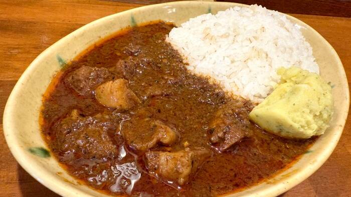 カレーの中に隠し味として甜麺醤を使っていて、ひき肉にも甜麺醤で下味が付いています。これがコクと深みになっています。