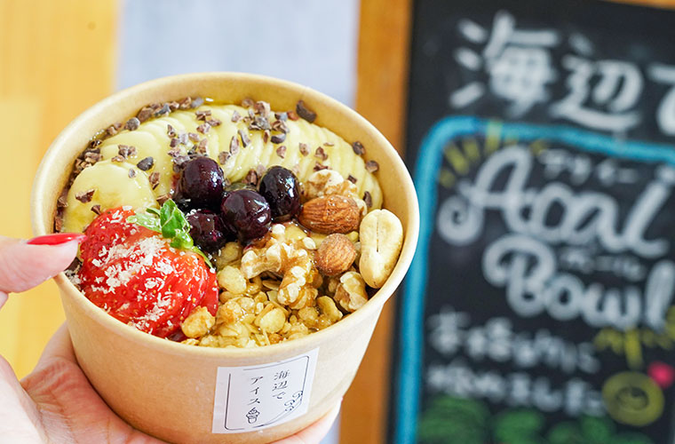 たつの市の新舞子浜の目の前に店を構える「海辺でアイス」。看板メニューのソフトクリームのほか、秋冬はアサイーボウル、春夏はかき氷も提供しています。