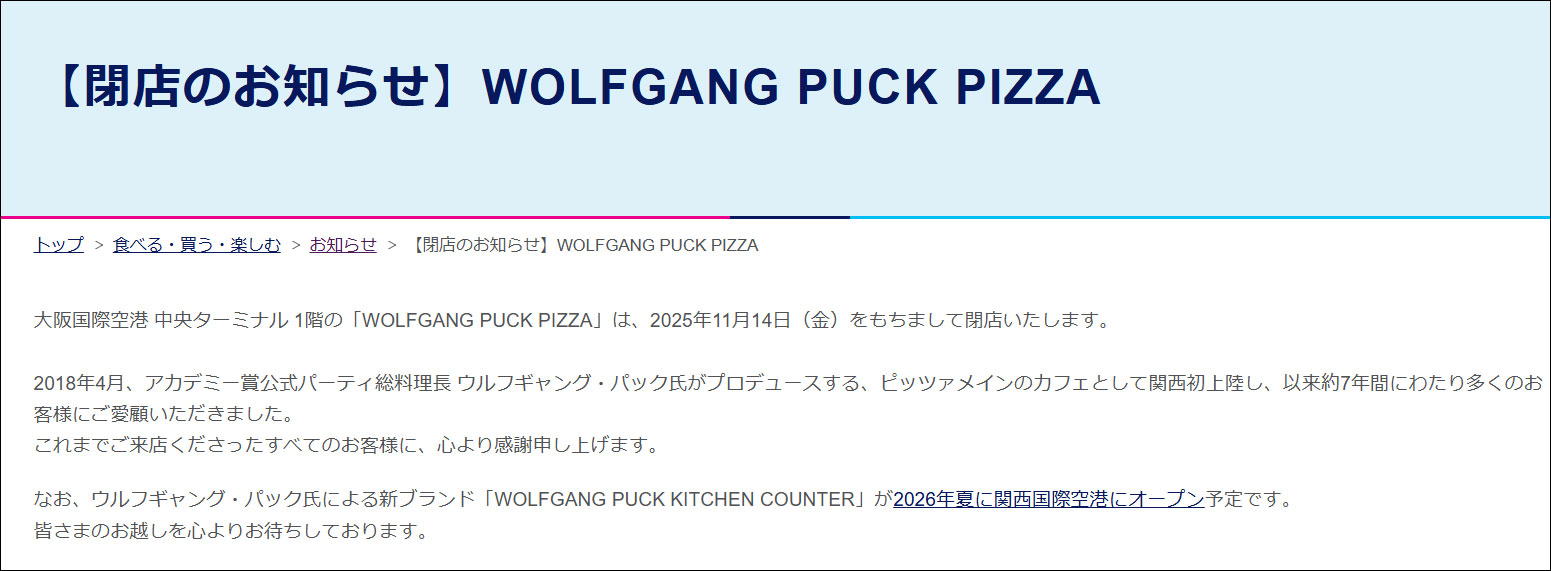 伊丹空港にある「WOLFGANG PUCK PIZZA(ウルフギャングパックピザ)大阪国際空港店」が閉店している