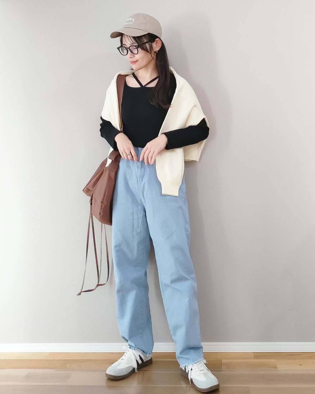 長袖の黒トップス×デニムパンツは、10月の気候にピッタリですが、一方で地味見えすると感じることも……。