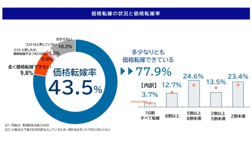 調査結果によると、コスト上昇分に対する販売価格への転嫁度合いを示す「価格転嫁率」は43.5%だった。これは、コストが100円上昇した場合に43.5円しか販売価格に反映できず、残りの6割超を企業が負担していることを示している。前回2月調査と比較すると1.0ポイント改善した。