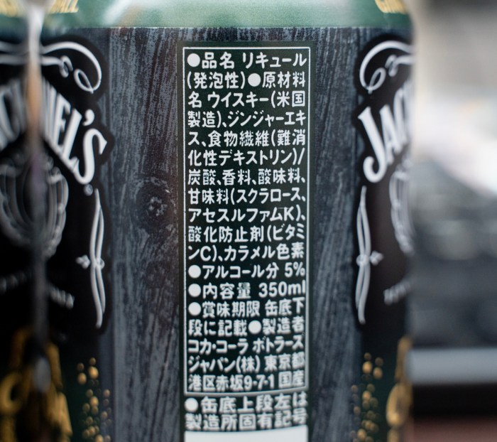 まずは成分をチェック。ウィスキーの他に色々入っている。ジンジャーエキスが2番目に多いもよう。まあ、ジャックダニエルとカナダドライなのかなという感じ。