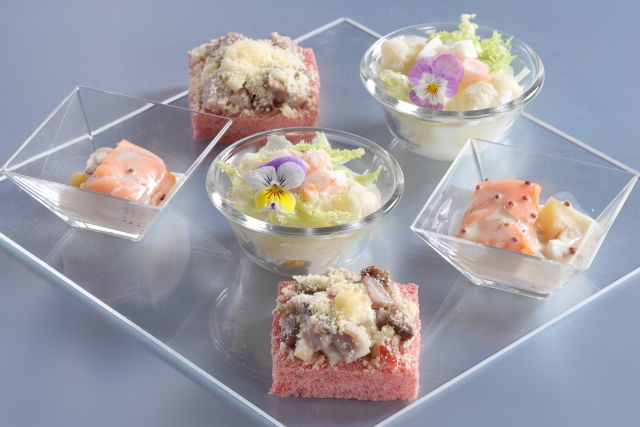 <下段>上側左側から時計回りに「リンゴとはちみつのスコーン」、「スモーク鴨 ベリーバルサミコソース添え」、トリュフがほのかに香る「ほうれん草ときのこのキッシュ」、クリームチーズを包んだ「スモークサーモンボール」