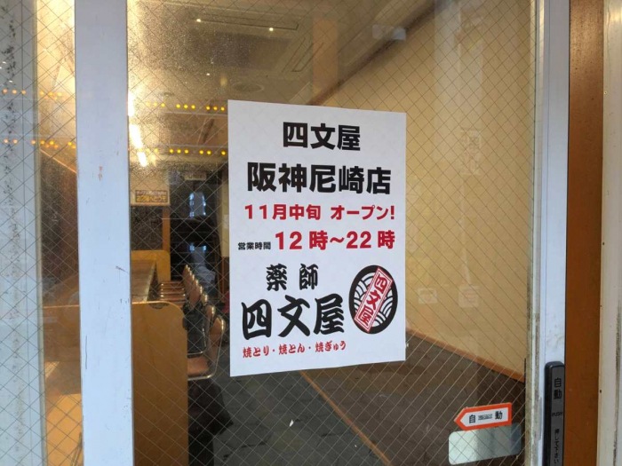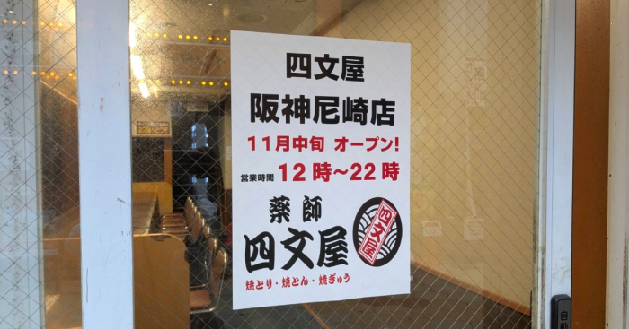 尼崎中央商店街で長年営業していた『餃子の王将 阪神尼崎店』が移転に伴い、7月末に一度営業を終了。「跡地には何ができるのだろう」と気になっていたところ、11月中旬に『四文屋 阪神尼崎店』(尼崎市)がオープンすることが判明しました。