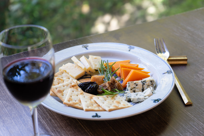 「グラスワイン」(700円)と好相性の「3種のチーズ盛り合わせ」(1,800円)は、ミモレット・ブルーチーズ・チェダーなどを贅沢に盛り付けた一皿。