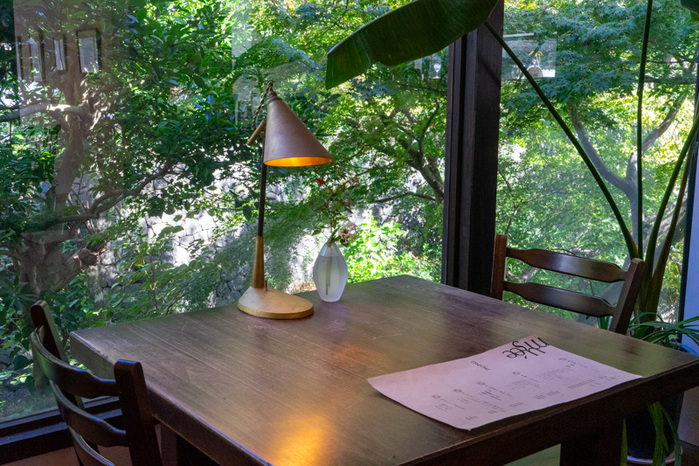 階段を登った先には、ヨーロッパのカフェを思わせるよう落ち着いた空間が広がり、大きな窓から見える豊かな緑に癒されます。