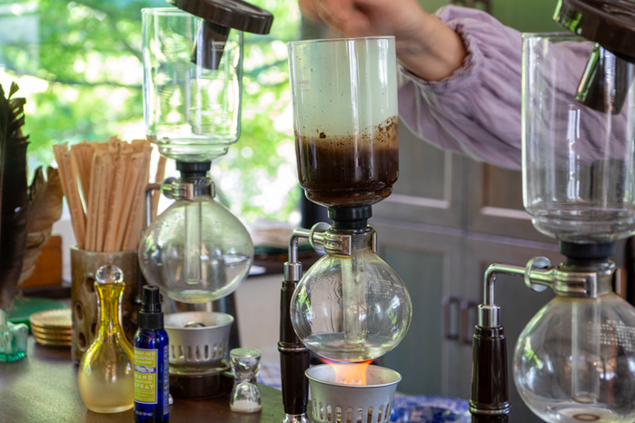 作品鑑賞のあとは、サイフォンで丁寧に淹れられる一杯で、静かな余韻に浸るひととき。