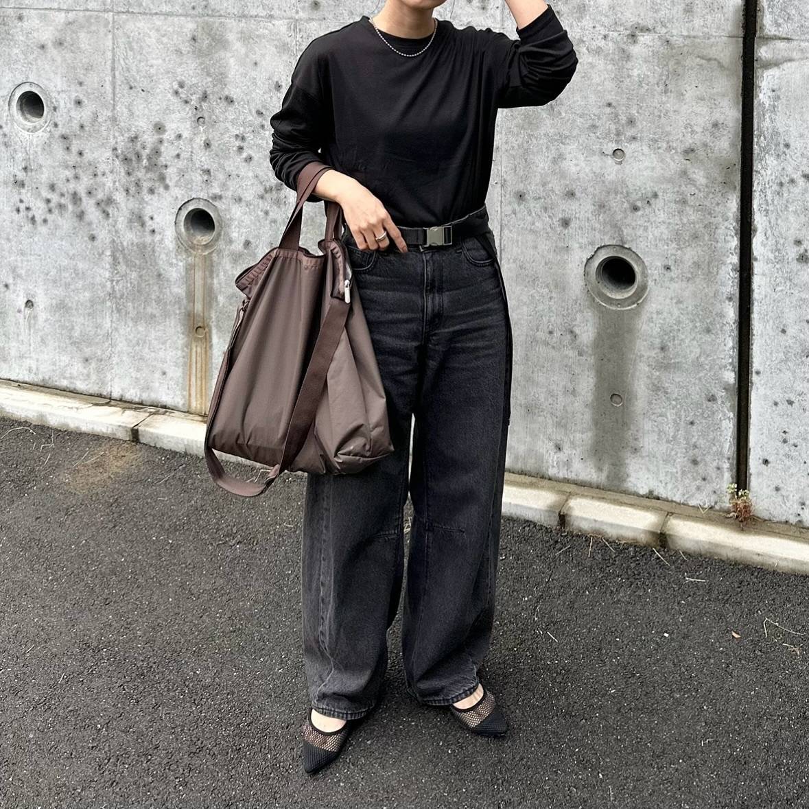 バッグや靴などの小物も、パンツ同色の黒を選ぶと◎