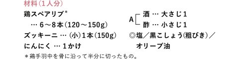 1 ズッキーニは長さを半分に切って縦半分に切る。にんにくは縦半分に切って芯を除き、つぶす。鶏スペアリブは塩小さじ1/4、黒こしょう少々をふる。Aは混ぜ合わせる。