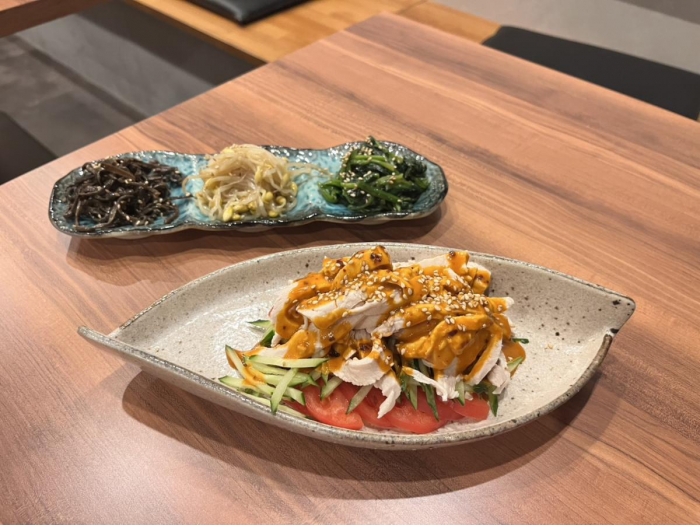 注文したのは「ナムル盛り合わせ」と新メニューの「棒棒鶏」。しっとりと仕上げた蒸し鶏に、特製のピリ辛ソースが食欲をそそります♪きゅうりとトマトが敷き詰められ、さっぱりしながら食べ応えもある一品です。