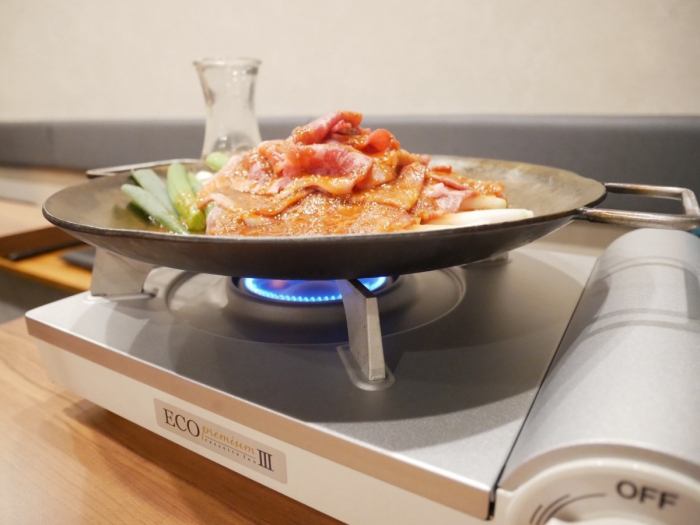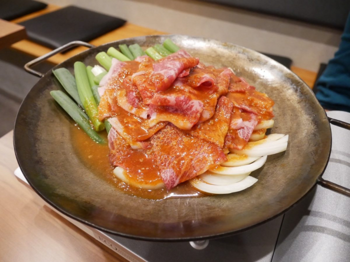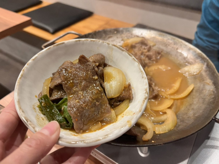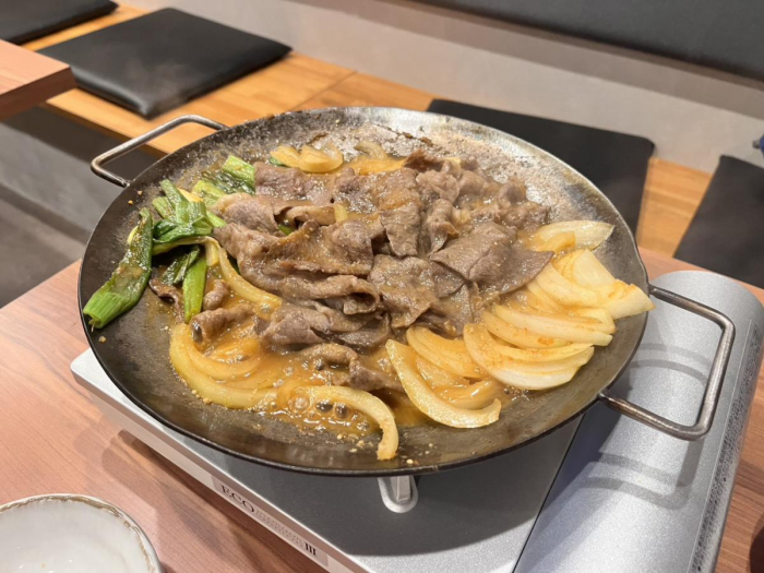 あっという間に鉄板鍋が完成しました。ベースの具材は野菜がネギ・玉ねぎのみなので、お好みで追加の具材を注文することも可能♪