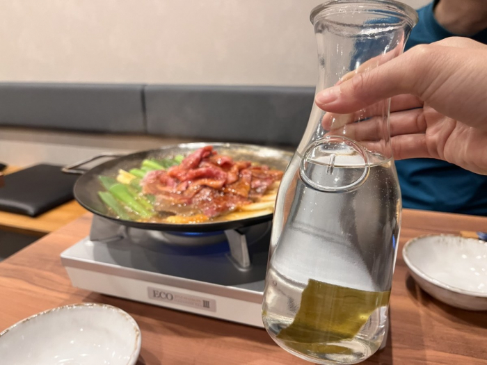 黒毛和牛鍋のベースはコク深い味噌味。もともとしっかり濃いめに仕上げられているので、好みに合わせてお水を足しながら自分好みの味に調整していけるのもポイントです。