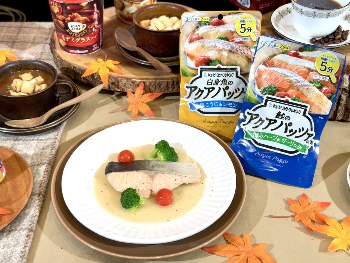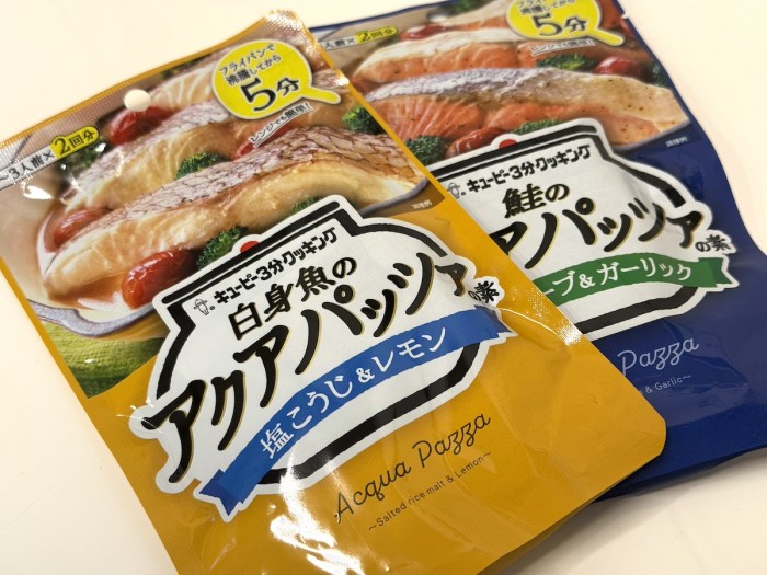 ラインナップは「鮭のアクアパッツァの素 3種のハーブ&ガーリック」と「白身魚のアクアパッツァの素 塩こうじ&レモン」の2種だ。