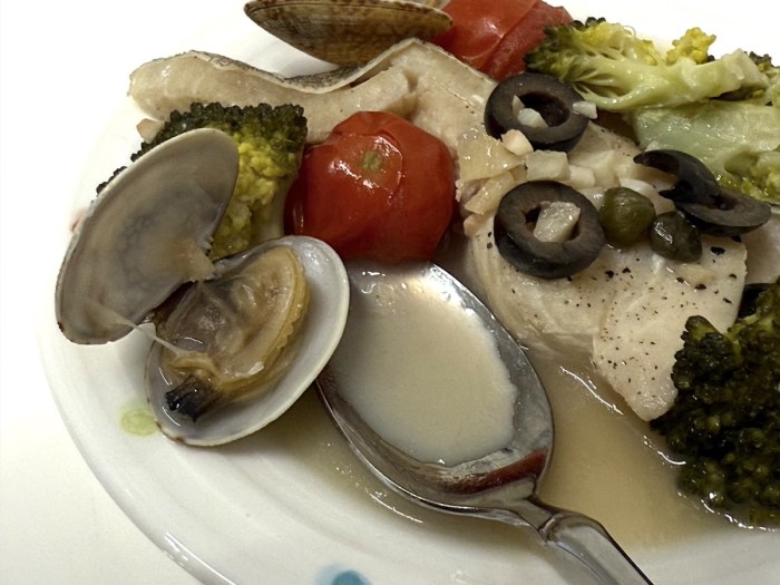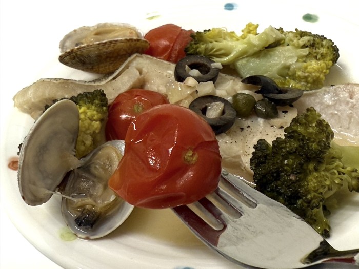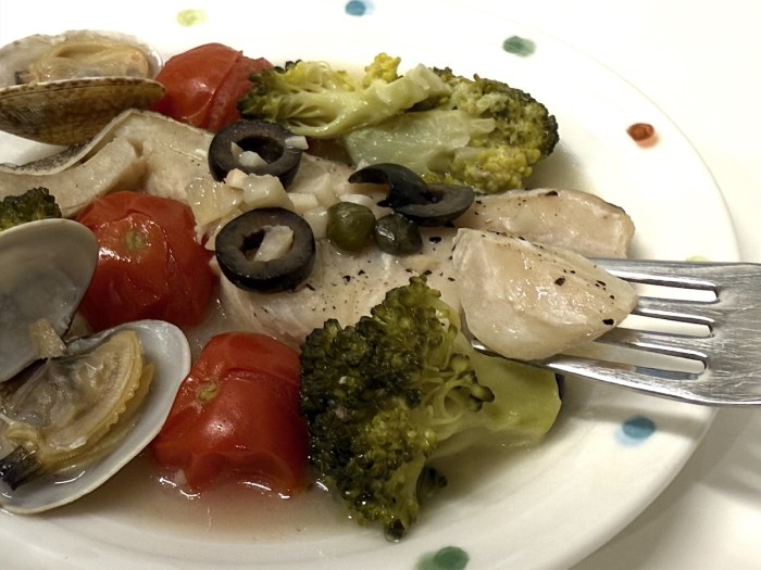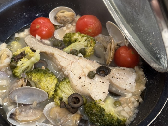 見た目はアサリやケッパーやオリーブの入ったお手製のほうが断然ゴージャスで具だくさん! 手をかけただけのことはある。アクアパッツァ自体がかなり写真映えする料理で、スキルゼロの人間が作ったとは思えない。スープたっぷりの蒸し焼きだから、フライパンが焦げたりしないのもいい。