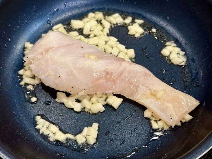 焼いていこう。アクアパッツァとはイタリア語で「狂った水」という意味だそうで、たっぷりのオリーブオイルがポイント。この時点でかなり美味しそうな匂いがする! そりゃそうだ、オリーブオイルとニンニクの組み合わせがマズいわけないもんな! 期待がふくらむ!!