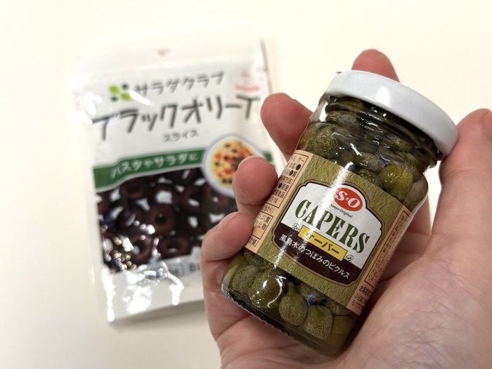 一番苦労したのが「ケッパー」だ。響きが「ペッパー」と似てるし、たぶん香辛料のたぐいだろう。もしかして、ちょっとお高い店に行ったときステーキに載ってる赤い粒かな(それはピンクペッパーだった)と思ってスパイスコーナーを探したが、一向に見つからない。探すべきは瓶詰めコーナーだったようだ。「ケーパー」って書いてあるけど、これでいいんだよね?
