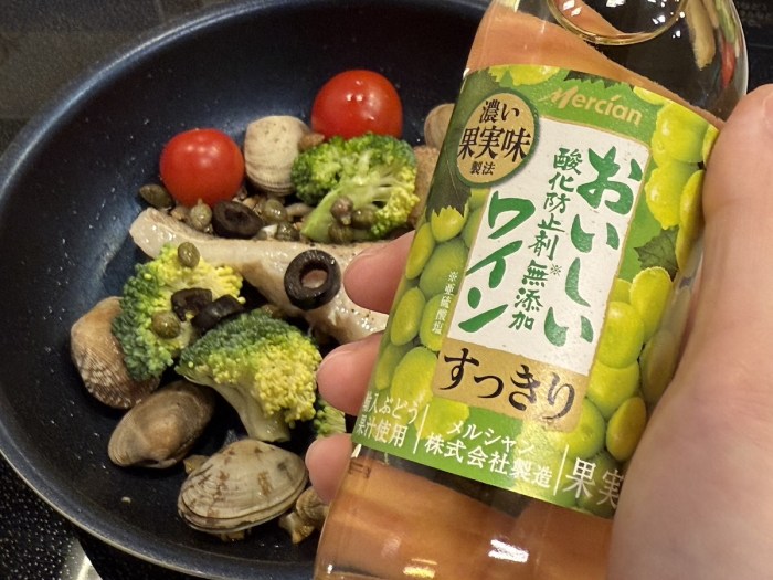 キモになるのが白ワイン。筆者は下戸なので、普段から家に調理酒やワインの備蓄はない。適当に小瓶を買ってきた。