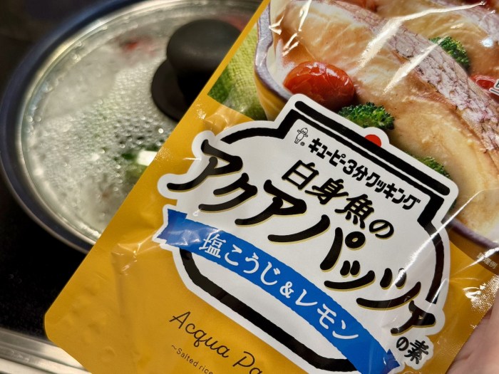 自炊にはいろいろな材料を揃えなければならない、というハードルを一挙に飛び越え、なんなら切り身を1パック買ってくるだけでメインディッシュができるキユーピー「アクアパッツァの素」。
