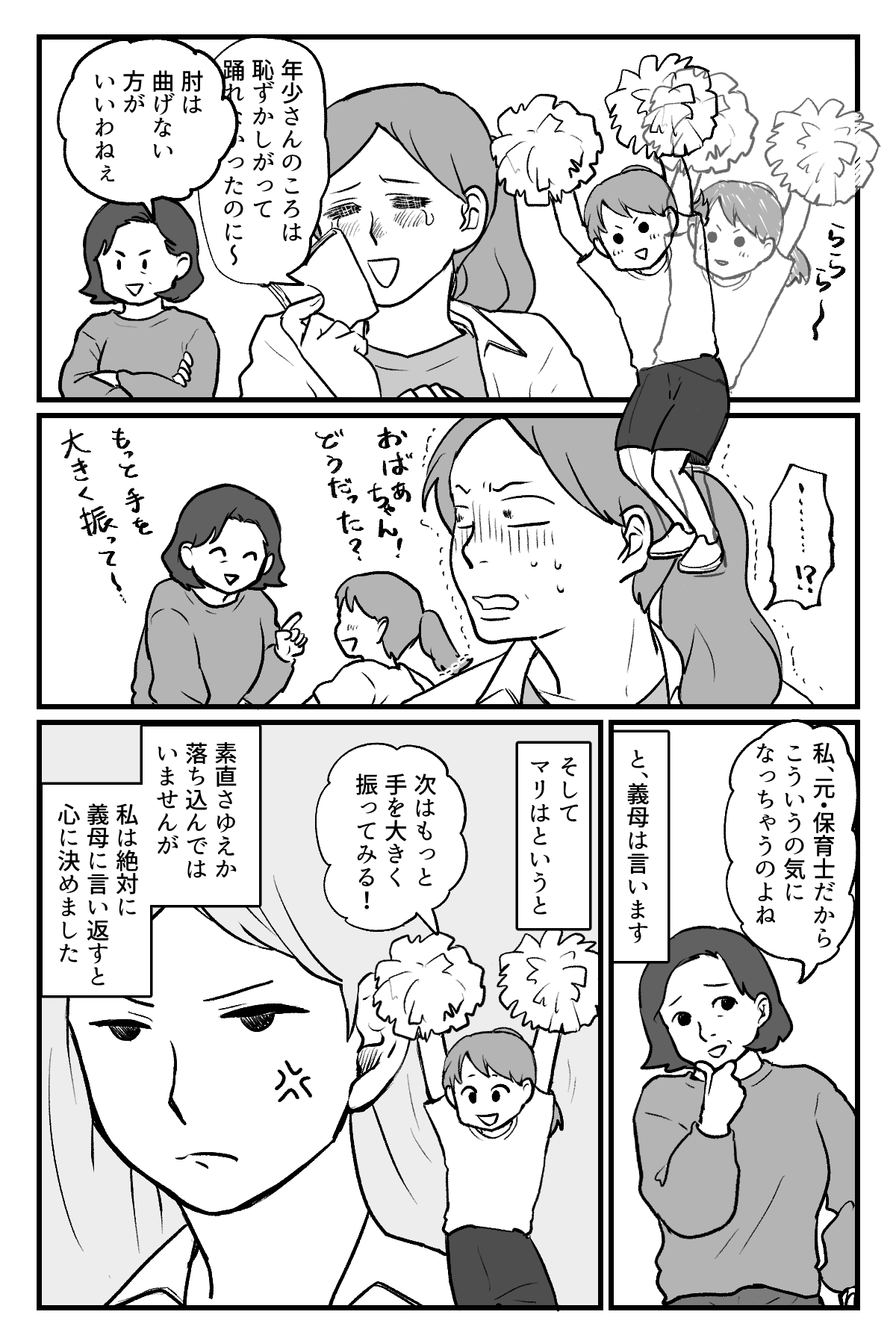 義母は元保育士という経歴が自慢なのでしょう。「元保育士だったこと関係ある!?」という場面でも「自分は元保育士だったから、こういうことが気になる」と言ってきます。 もちろん助かっていることもたくさんありますよ? でも、上から目線なひと言のせいでせっかくのいい思い出が台無しになることもあるんです。長女マリのときにとてもイヤな気持ちになったので、それからは義母をイベントに誘わなくなりました。 けれど義母はスケジュールをチェックしていて、都合があえば来たがるのです。今回の運動会や発表会で、もしまた何か義母から余計なことを言われたら絶対に言い返してやる! と、そう心に決めました。
