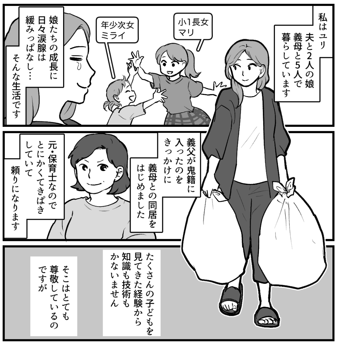 私はユリ。小学校低学年と幼稚園年少の2人の娘がいます。産後、義母は私の身のまわりのお世話をしてくれて大助かりでした。それもあって、いま私は義母と同居をしています。義母は元保育士なのでとてもてきぱきしていて、頼りになる存在です。