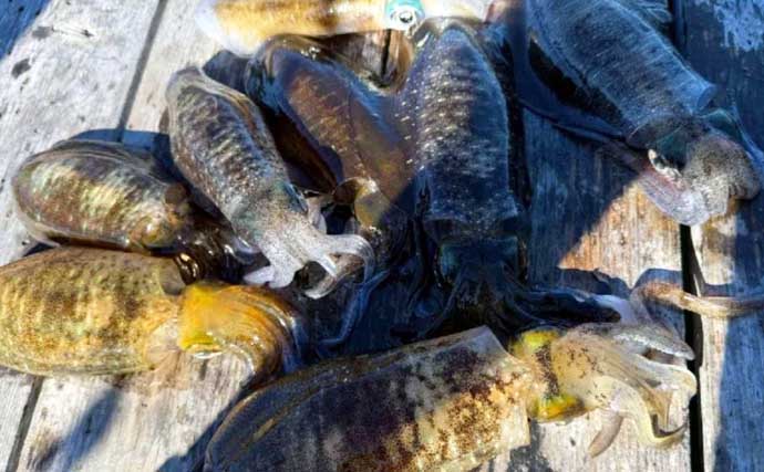 三重県志摩市にある浜島出船の大伸丸渡船では、11日にティップランでアオリイカがポツポツ上がり、3人で16匹をキャッチ。ほかにコウイカも。また、8日はアオリイカが爆釣し2人で30匹と大漁。サオ頭はなんと19匹をキャッチした。
