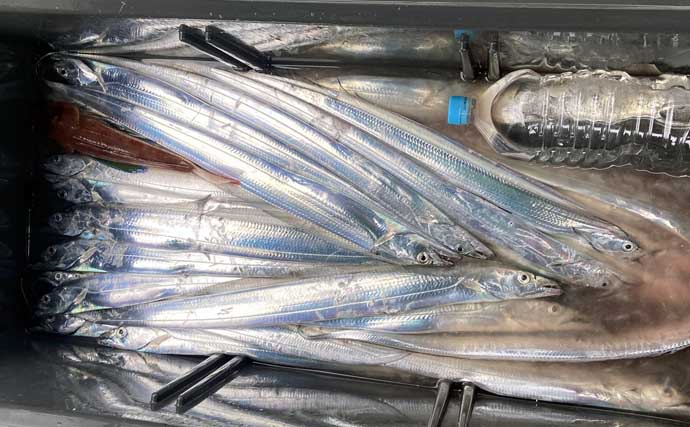 三重県伊勢市にある神社港出船の如意丸では、11日にジギングやテンヤでタチウオが連発し、80~100cmが1人15~40匹と好釣果。その後のタイラバでは66cmの大ダイが登場。また同日の午後はキャスティングで出船となり、70cm級ワラサが2匹キャッチされた。