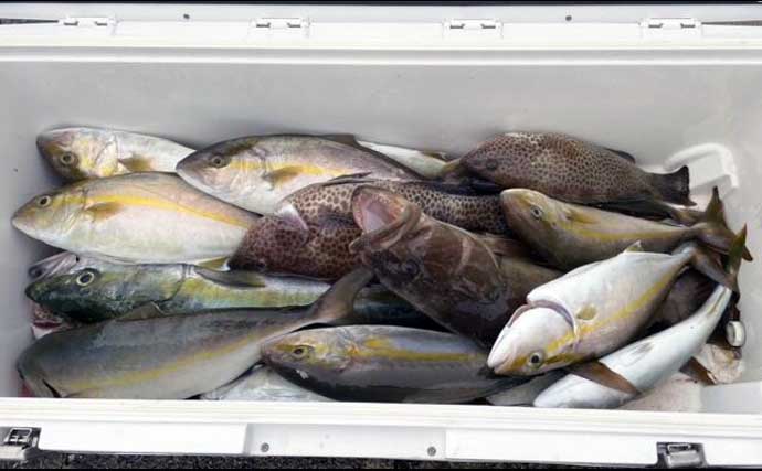 三重県・大紀町の錦から出船している喜盛丸では、13日にタテ釣りで出船し、カンパチ60~65cm5匹とシオ25匹、イナダ5匹とワラサ、オオモンハタ15匹など多彩に大漁。また、同日に同店のレンタルボートを利用した伊藤さんがアオリイカ8匹を、岡本さんら2人がシオ15匹とワラサ、イナダやオオモンハタなどをゲットし大漁。
