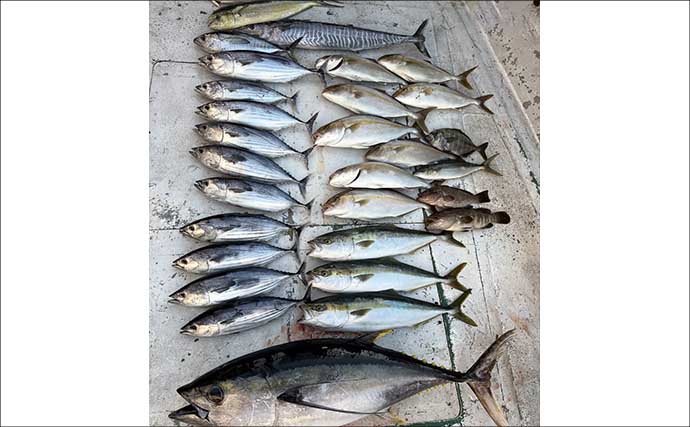 さらに移動先のポイントでトリヤマが立ちツバスやサゴシをキャッチ。ポイントを移動する先々でサワラ、サゴシが連発し船長も汗だくのランディングラッシュとなりクーラー満タンの好釣果。予約受付中。