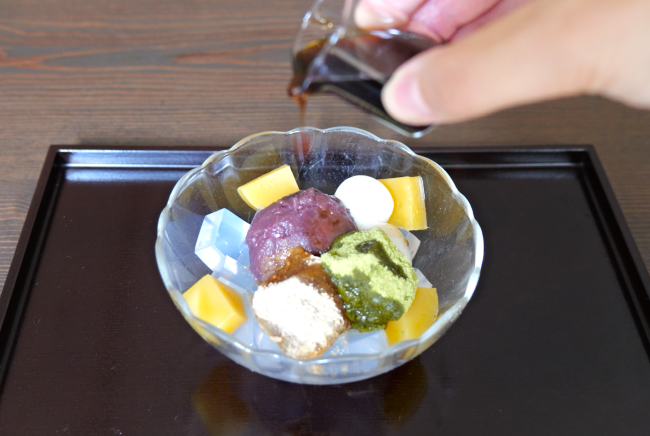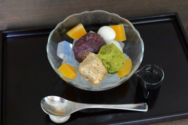 やさしい甘さの黒みつをたっぷりかけていただくのがおすすめ。どこから食べようかなと思わず迷ってしまう、和菓子の魅力がぎゅっとつまったぜいたくな一品です。