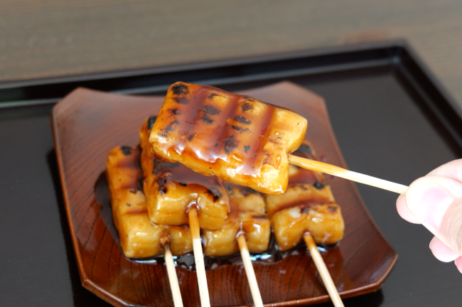 『うめぞの CAFE & GALLERY』では、注文を受けてから丁寧に焼き上げ、タレをたっぷり絡めた、でき立ての状態で提供しています。表面の焦げ目のカリカリ感と香ばしさ、中のモチっとした食感が堪りません……!