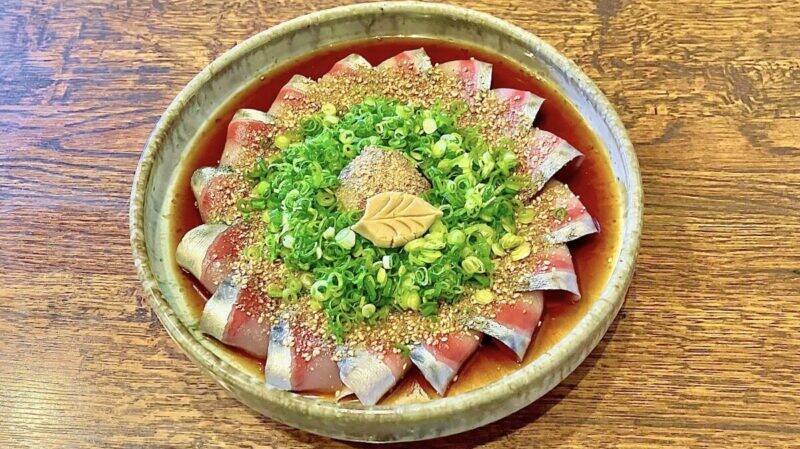 蒸し寿司を食べながら、カウンター越しに刺身を引く様子を眺めたり、女将との会話を楽しみます。ここで女将が日本酒をおすすめしてくれたのもナイスタイミング。私、刺身には日本酒を合わせたい派なんです。おすすめの中から「杜の蔵」と「とどろき酒店」がコラボレーションしてつくった「カラクチサムライ」を選びました。