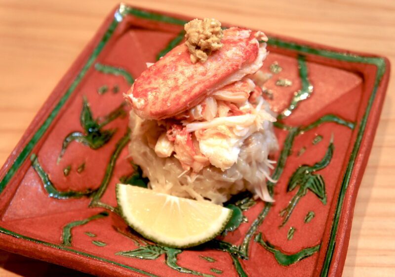 椀ものの後に出てきた「毛ガニしゅうまい」には驚きました。子どもの握り拳ぐらいの大きな焼売の上に、たっぷり盛られた毛ガニの剥き身……脚の身がまた立派なこと!