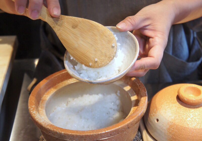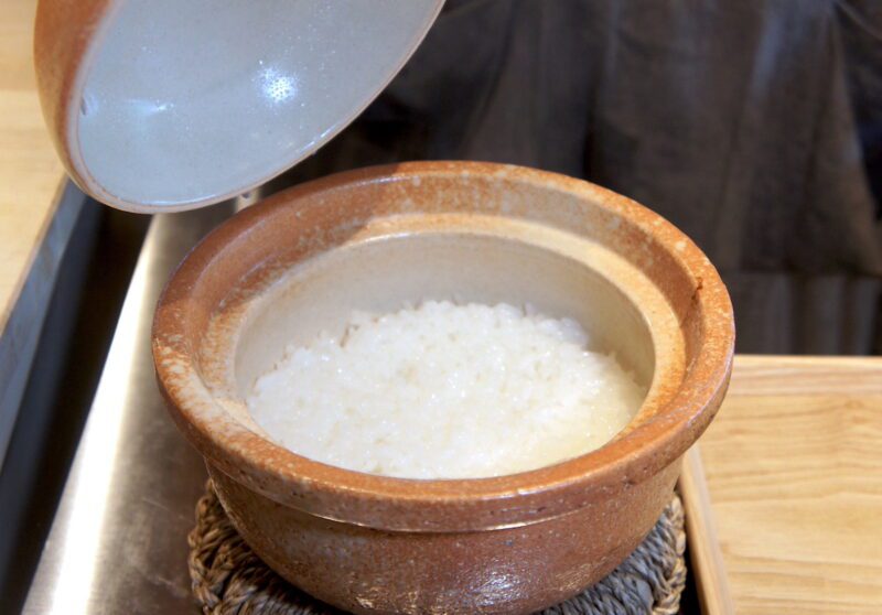 メインの品の後にご飯が登場です。食べ進むタイミングを見計らい土鍋に火を入れ、炊き立てを提供してくれます。