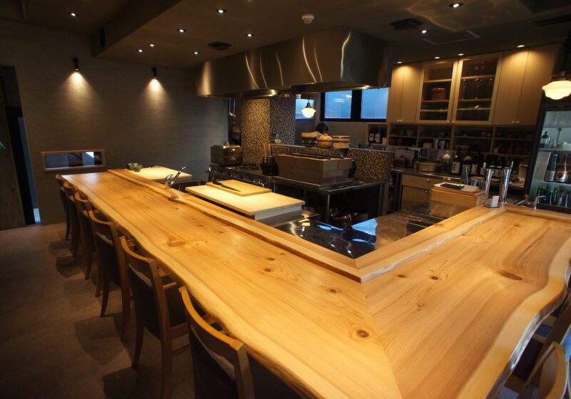 場所はキャナルシティ博多の南側、道路をはさんだ角に建つビルの2階です。「初めての方でも入りやすいように」と内装はモダンに、また「お客様とのいい距離感が保てるように」とオープンキッチンかつカウンター席のみのレイアウトにしたそうです。