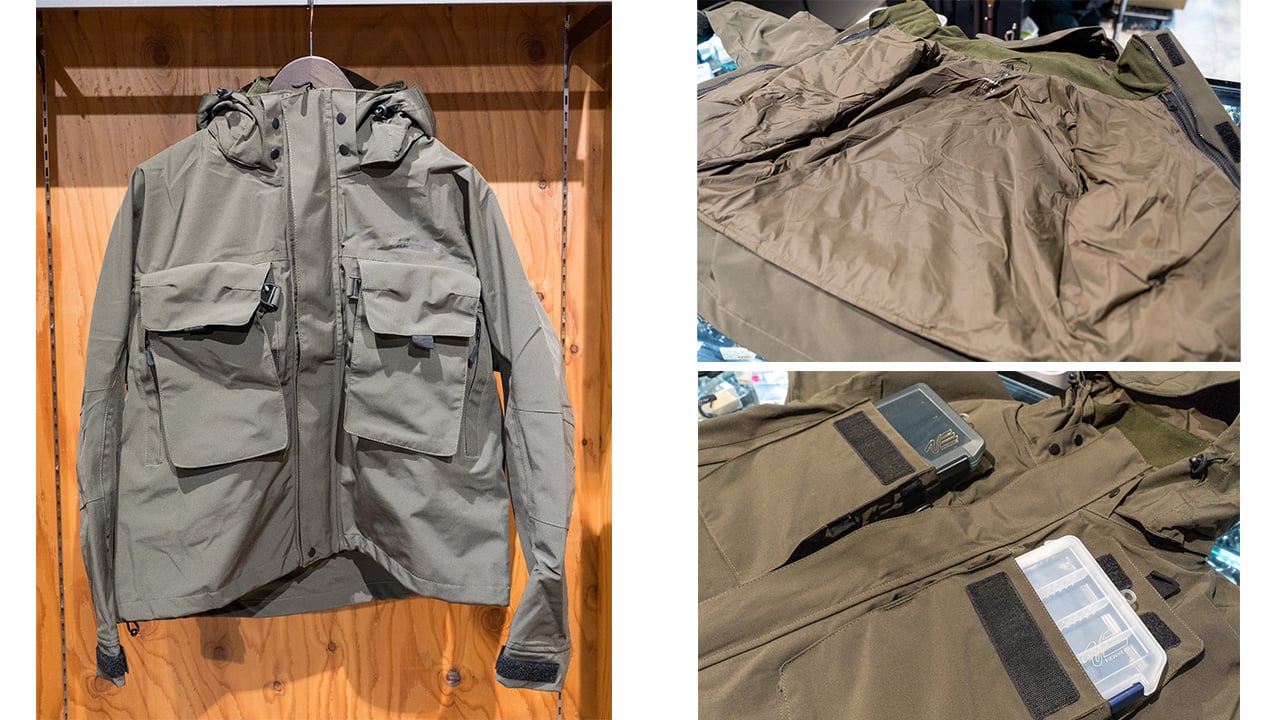 左/透湿防水素材を採用したセミショート丈のDTサーマルWDジャケット(リトルプレゼンツ)。右上/取り外し可能な中綿入りのインナーベストが付属 右下/前面ポケット(左右2ヵ所)にはMEIHO『VS-3010』シリーズ同等のルアーケースが収納可能