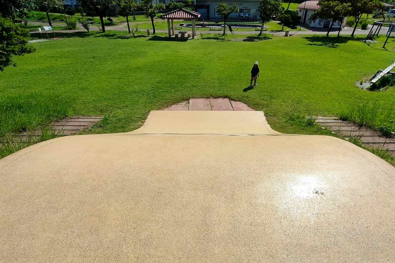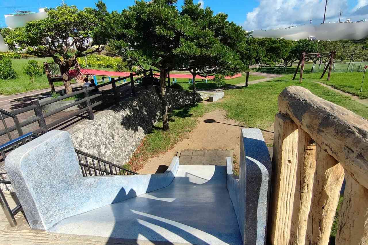 すべり台はコンクリート製で、表面はすべりやすくなっています。すべり台部分から上がると転倒しやすく危険なので、両サイドにある階段から上がりましょう。小学生に大人気のすべり台で、来るたびに楽しそうにすべる子どもたちの姿を見かけます。