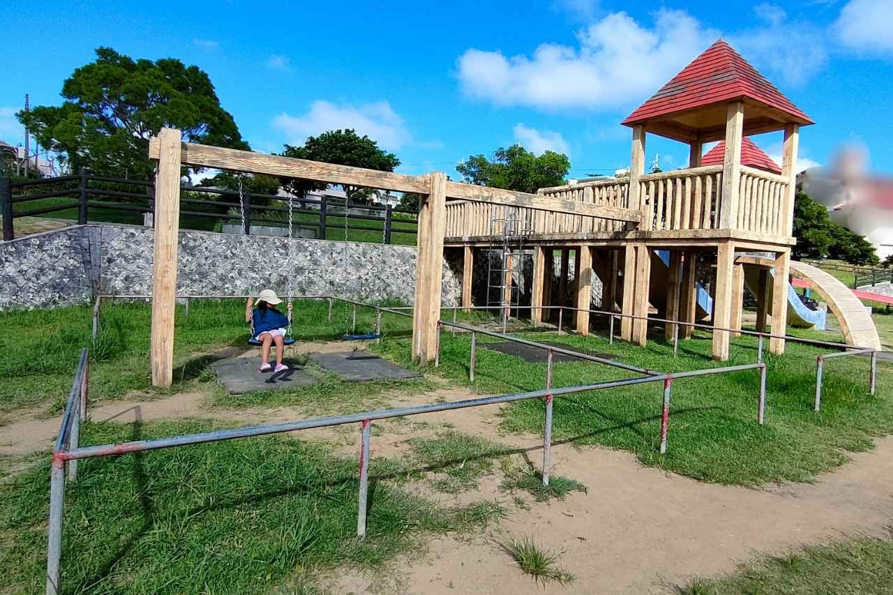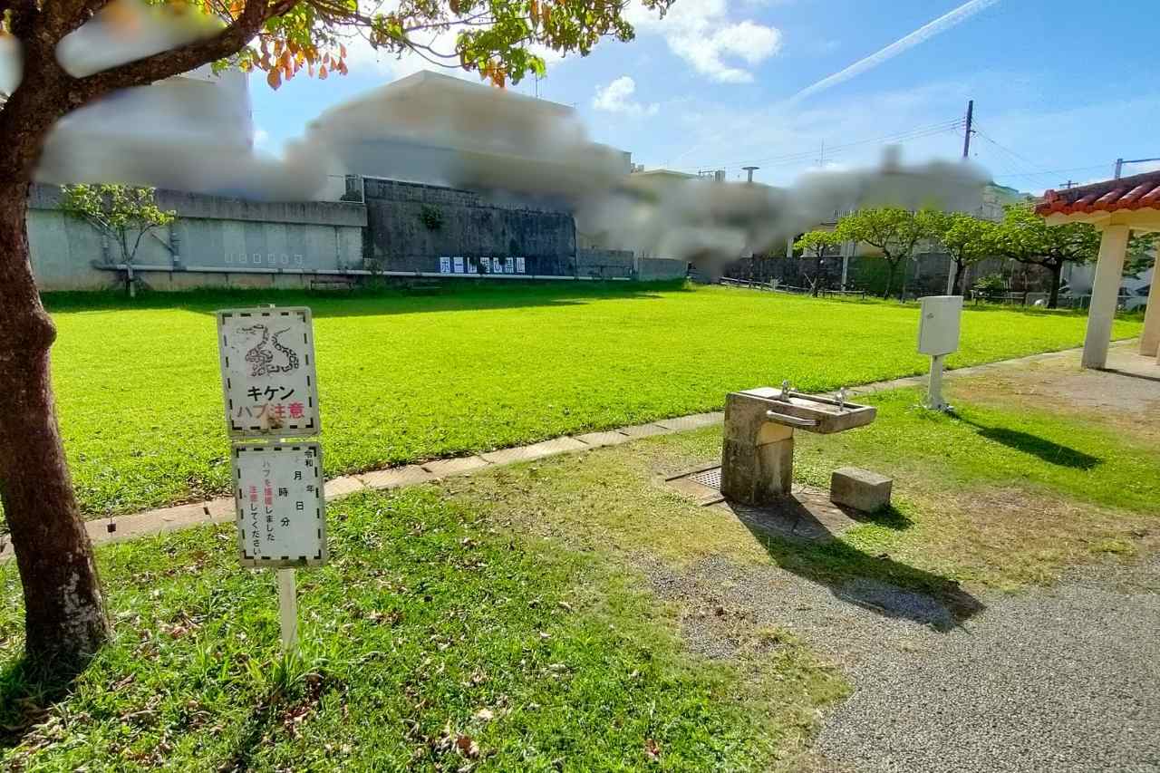 住宅に面した芝生広場は、水飲み場や東屋が近くて快適です。ボール遊びはできませんが、緑を眺めながらリラックスできます。過去にハブが捕獲されたとの看板がありましたが、公園内ではハブが好む草の茂み、溝部分、壁や石の隙間を避ければ楽しく遊べます。