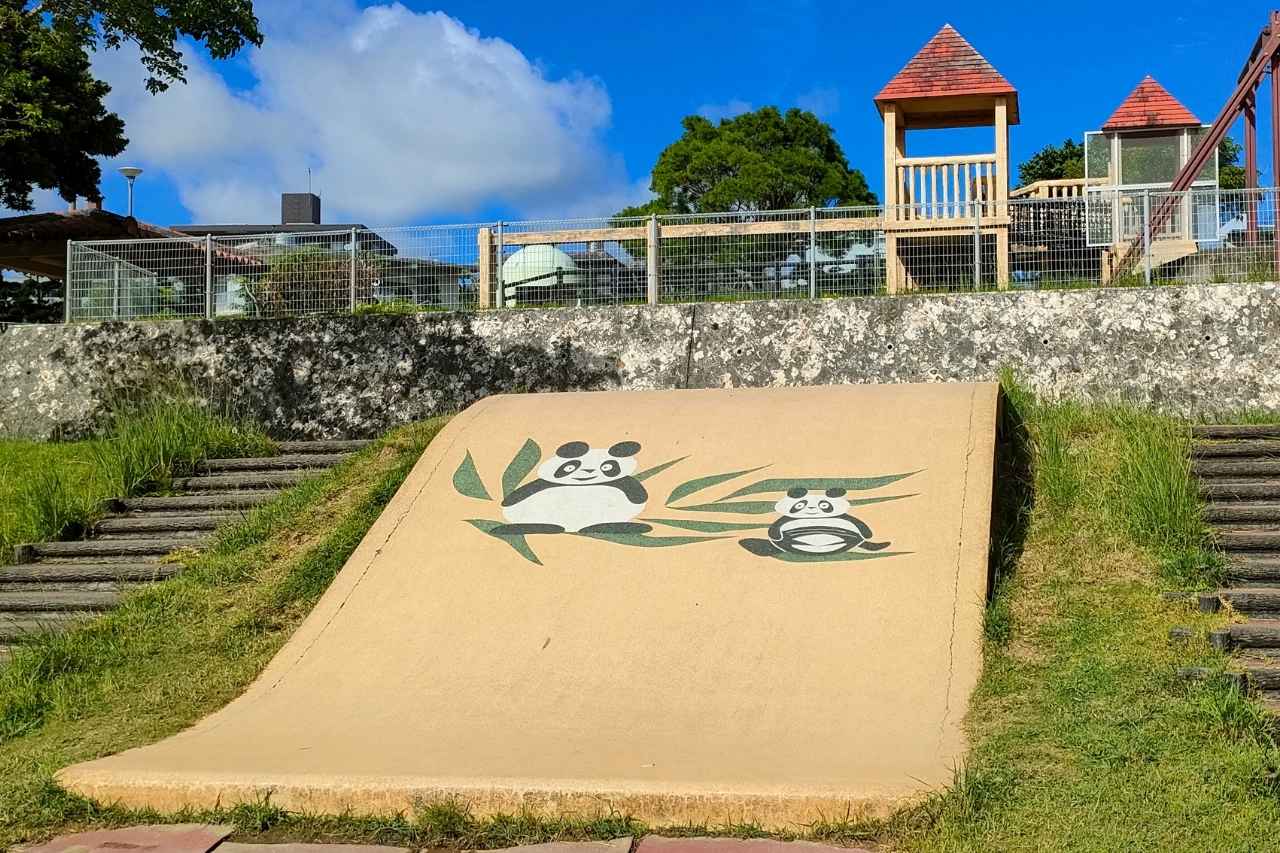 健康器具コーナーの斜め向かいには大きなすべり台エリアがあります。レトロでかわいいパンダの絵からノスタルジックな雰囲気を感じます。